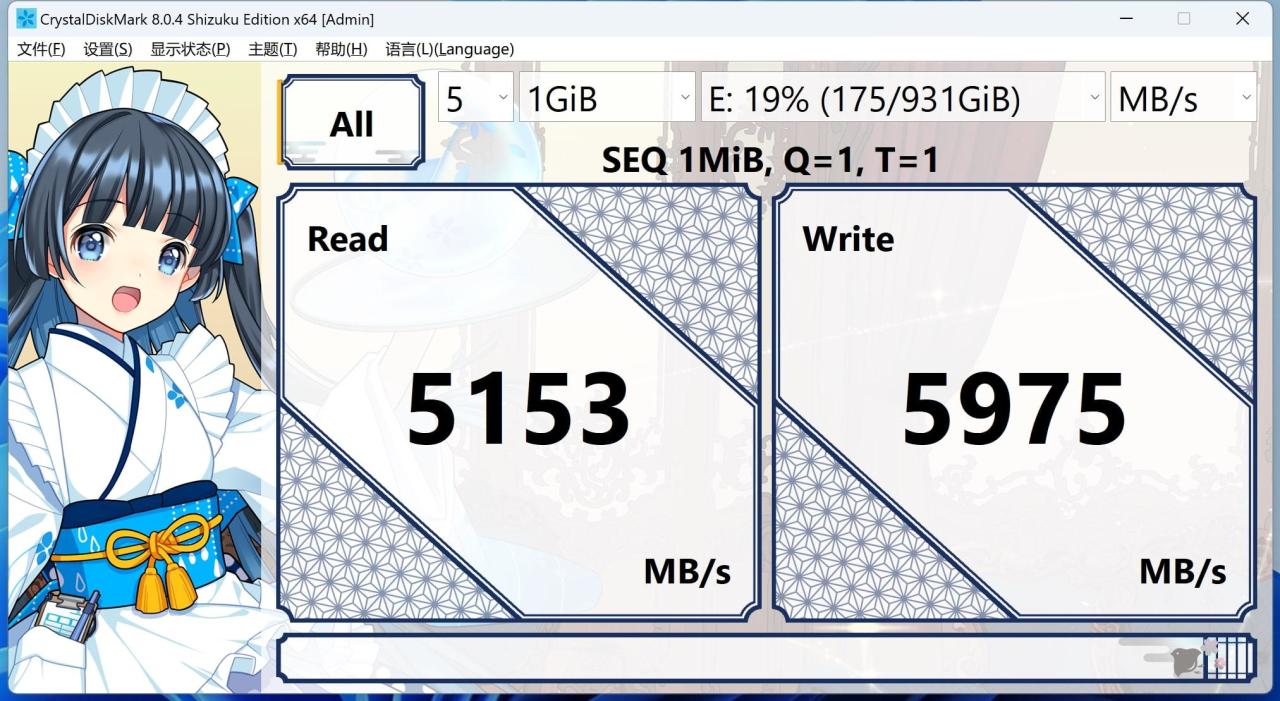 SN850X 1TB作爲旗艦消費級SSD,就針對這類低隊列讀寫場景做了專門優化。可以看到在Q1T1下,粒度爲1MB時,SN850X 1TB的順序讀寫速度分別達到了5153MB/s和5975MB/s,已經超出了Windows下單任務的讀寫上限,完全可以滿足日常的讀寫需求。