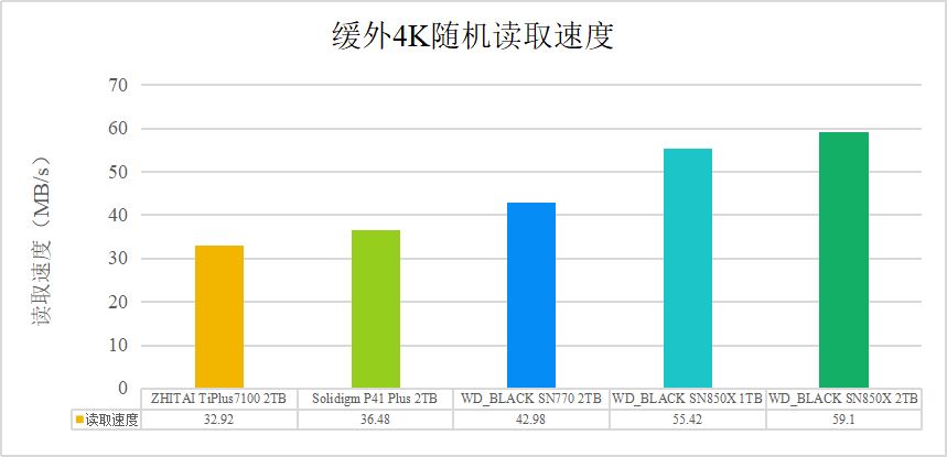 單單這麼說還不夠形象,那咱們就拿致態TiPlus7100 2TB、Solidigm P41 Plus、WD_BLACK SN770 2TB等無緩盤的該項性能來進行對比吧: