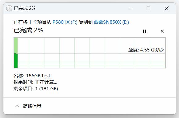 緊接着我們使用FIO生成了一個186GB的不可壓縮僞隨機數據測試文件,從電腦上的400GB傲騰P5801X中向SN850X進行寫入,以觀察實際表現。