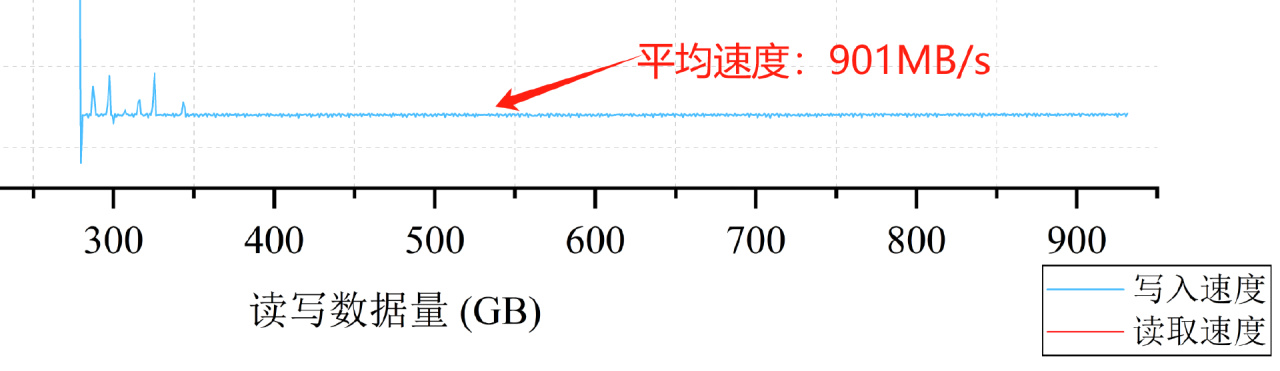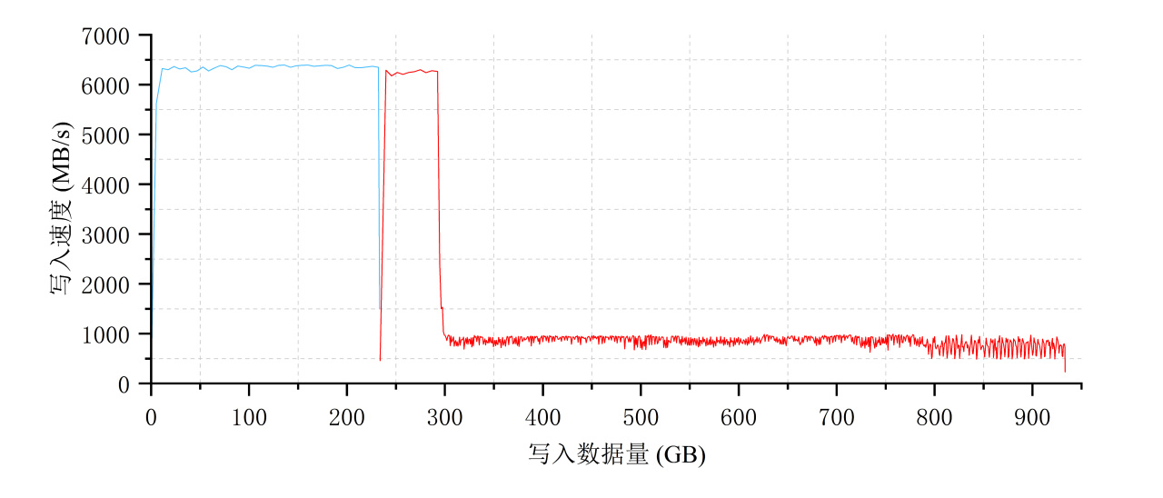 當SLC Cache耗盡時,SSD的寫入速度會下降至900MB/s左右,這是因爲此時主控需要一邊將SLC Cache佔用的空間進行GC垃圾回收、重寫入3bit的TLC容量中,同時還要兼顧將新數據進行寫入的工作,面臨着極高的負載。