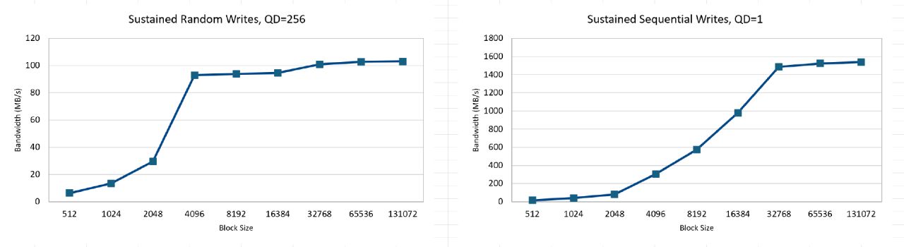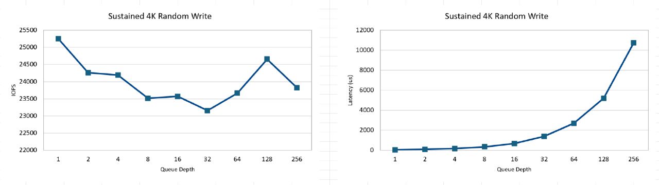 持續4K隨機寫入只要隊列深度爲1即可達到最佳性能,是最最明顯的消費級SSD調校風格,出道即巔峯,不需要追求高併發性能: