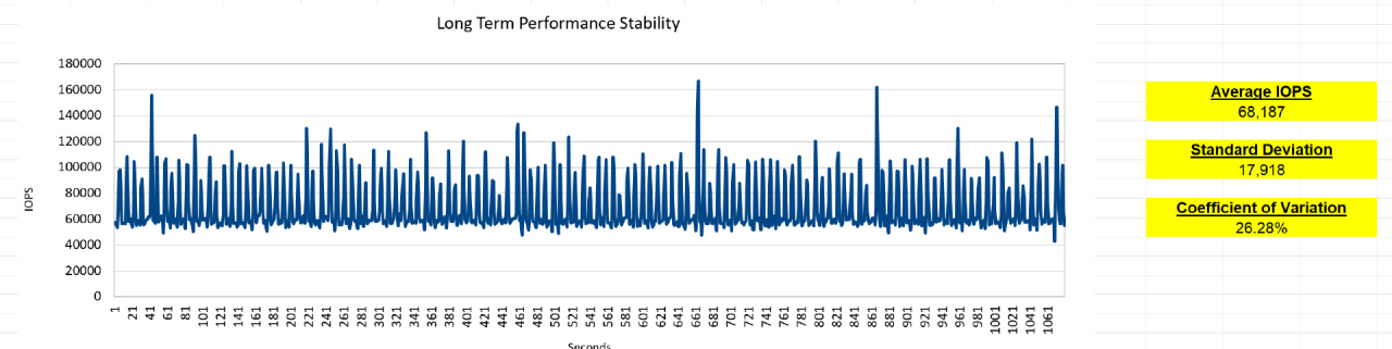 SN850X 1TB的7讀3寫長時間性能穩定性測試,平均IOPS 68187,變異係數爲26.28%,屬於高於企業級SSD,但是在消費級SSD中較好的水平: