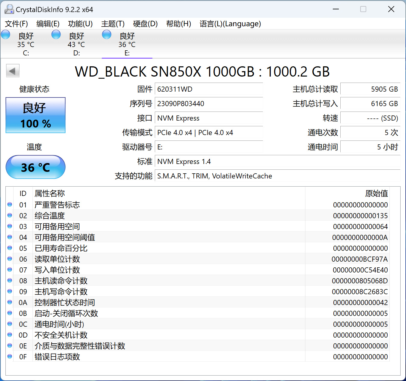 在CrystalDiskInfo中,可以看到WD_BLACK SN850X 1TB支持NVMe 1.4協議標準,可用容量爲1000.2GB(十進制)。額外留出的24GB屬於二級OP(Over-Provisioning,預留空間),有幫助SSD進行磨損均衡、緩解寫入放大、加快垃圾回収速度、延長壽命等作用,是SSD廠商給產品加上的第二層保險。