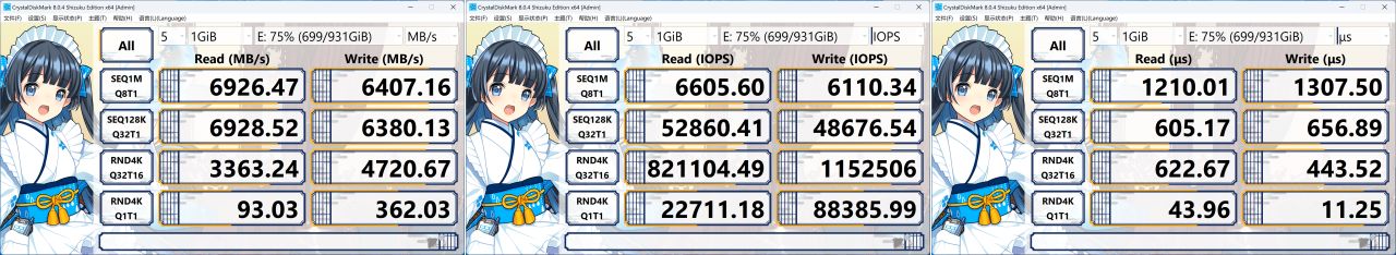 75%滿盤狀態下,同樣由於測試跑在了SLC Cache中,SN850X 1TB的順序讀取速度爲6926MB/s,順序寫入速度爲6407MB/s,Q1T1 4K隨機讀取速度爲93.03MB/s,相比空盤狀態看不出性能下降。