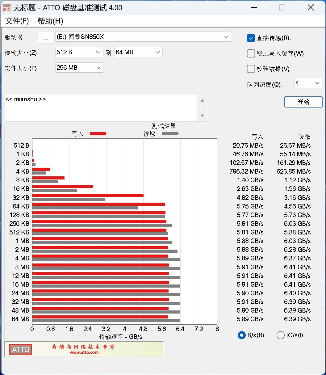 ATTO在測試時,會按512B, 1KB, 2KB直到到64MB等不同大小的粒度進行分別在隊列深度爲4的情況下進行讀寫測試,測試完成後的速度結果用柱狀圖的形式表達出來,可以很好地標識出SSD在低隊列下對於不同粒度數據的讀寫穩定性。