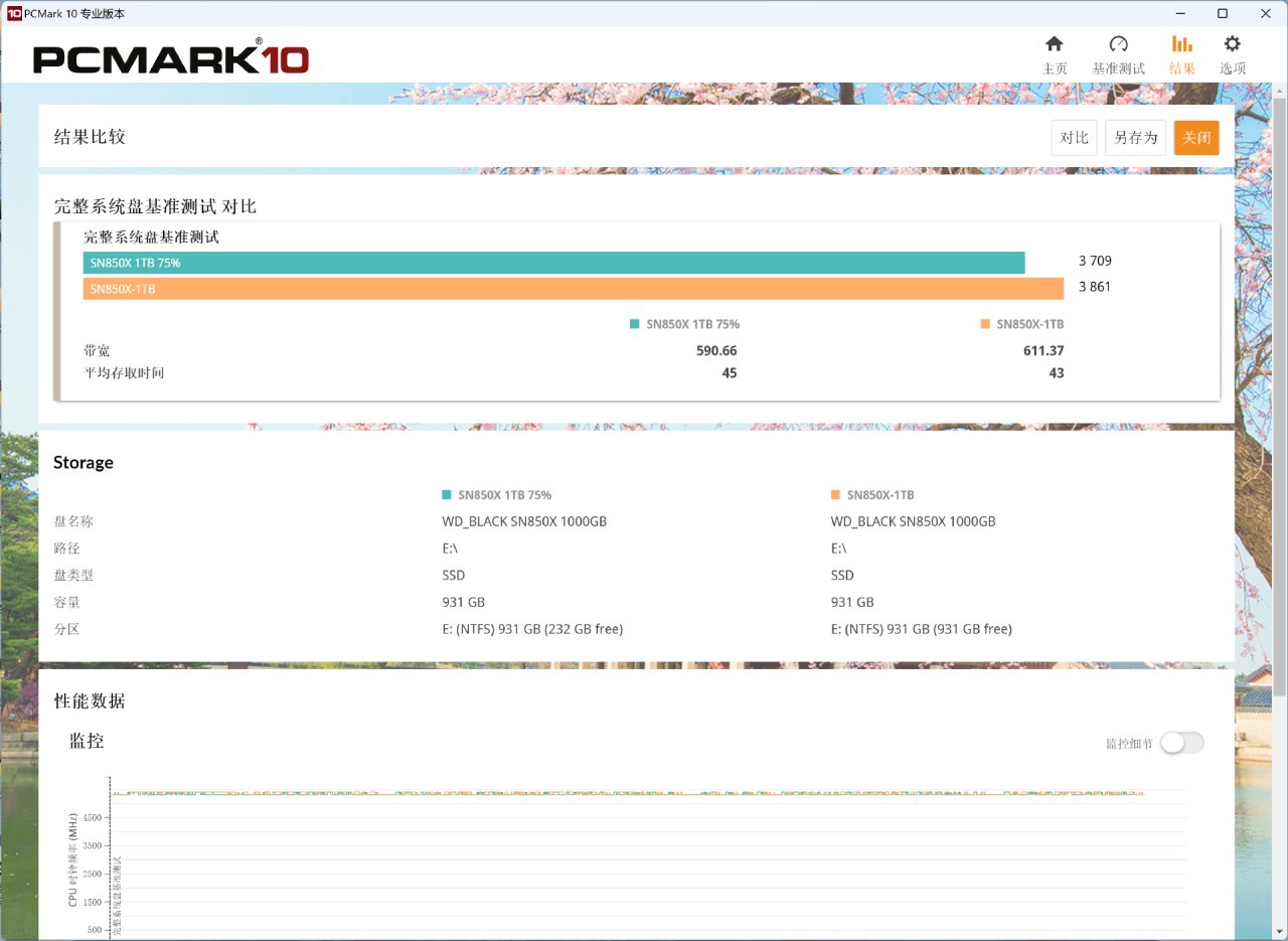 空盤狀態下,WD_BLACK SN850X 1TB的測試表現相當不錯,測試得分爲3861分,平均帶寬爲611.37MB/s,平均存取時間爲43μs,是目前旗艦PCIe4.0的優秀水平。