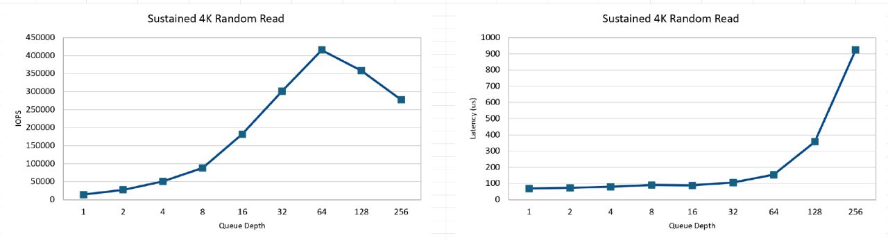 持續4K隨機讀取,在隊列深度達到64時即可發揮全部性能,並且此後隨着隊列深度太高,讀取延遲開始明顯增加,是典型的消費級產品特徵:
