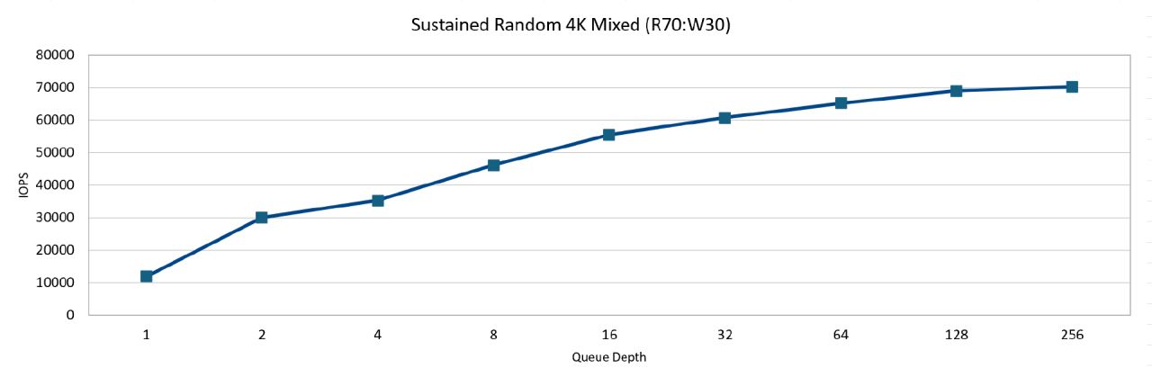 7讀3寫4K隨機測試中,在隊列深度達到256的情況下即可來到最佳性能: