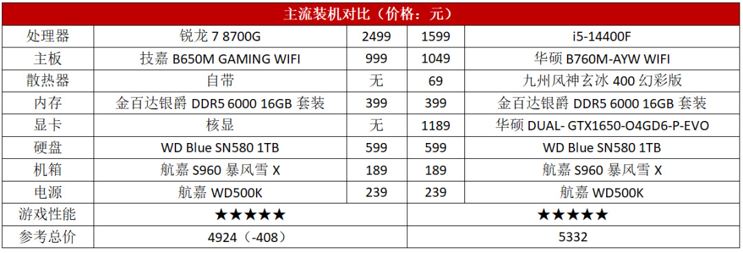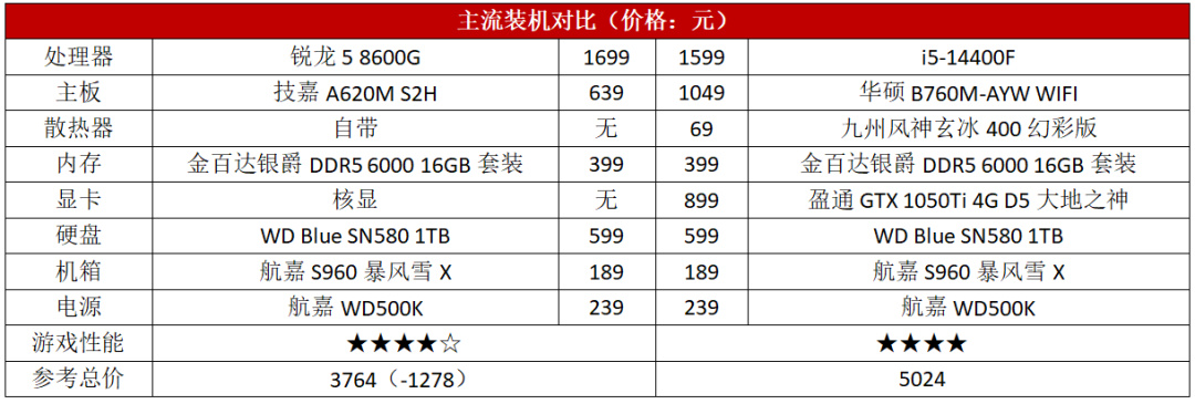 通过装机配置的对比可以看到,锐龙7 8700G平台在游戏性能和i5-14400F+GTX 1650 D6 4G打平的前提下,装机成本也不到5000元,装机成本便宜了400元以上。如果选择价格更实惠的A620主板,差距还能进一步拉大。而锐龙5 8600G平台装机成本更是只要3700多元,比i5-14400F+GTX 1050 Ti 4G便宜了上千,性能还领先。