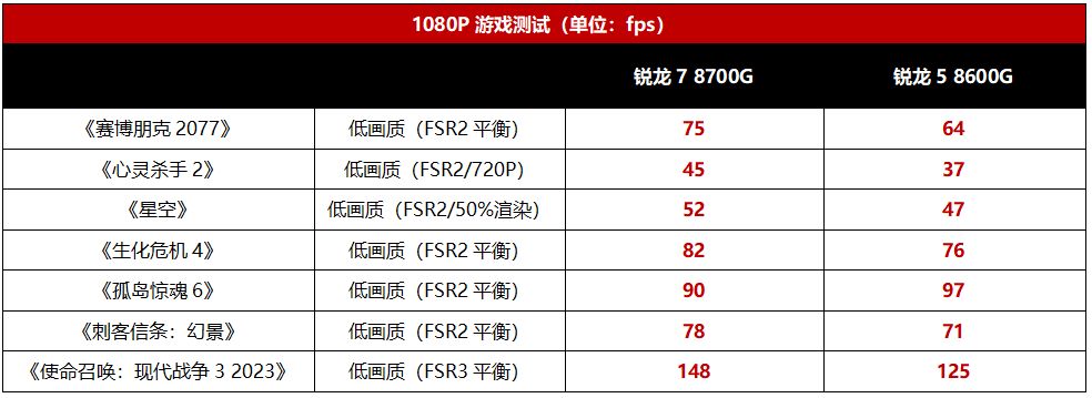 做个总结的话就是锐龙7 8700G和锐龙 5 8600G凭借更新的RDNA3架构核显,在游戏中的表现并不逊色甚至好于千元价位独显的水准。