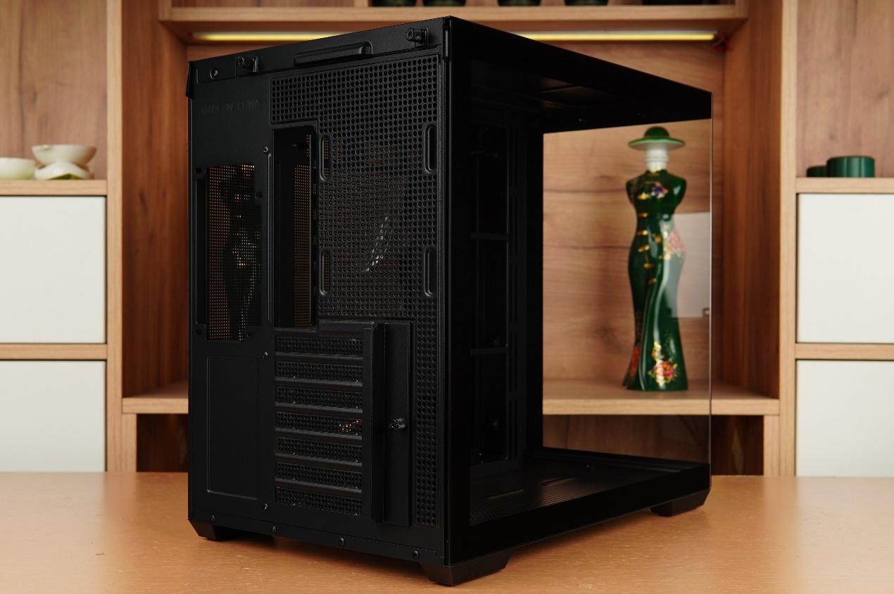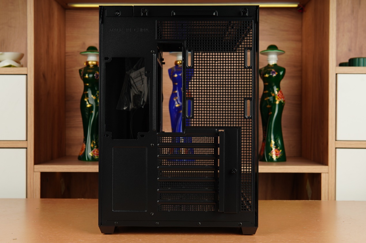 從機箱後方可以明顯的看到先馬映像採用了左右分倉設計,這種設計除了可以隱藏更多的線材外也可以讓主倉更好的展示PC組件。後方還有7條可重複拆卸的PCI槽。
