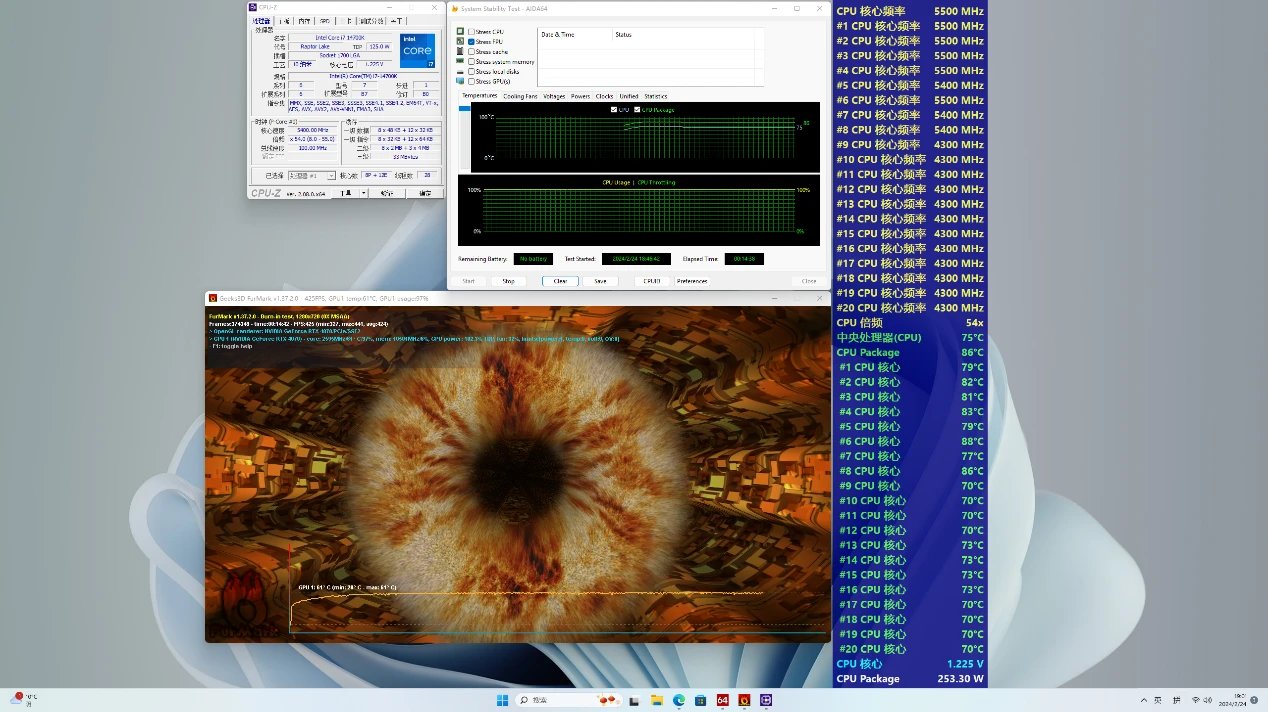 將CPU的默認電壓設置在offset-0.12V後同時雙烤10分鐘後,Intel酷睿i7-14700K功耗維持在250W左右,溫度保持在75°C,核心溫度穩定在86°C,P覈保持全核5.5Ghz,E覈保持全核4.3Ghz,表現非常出色;GPU的溫度則維持在了61°C,表現同樣出色,總體來看先馬映像的散熱能力還是相當不錯的,畢竟整機如此多的風扇加上大面積的通風孔設計,不好也難啊。