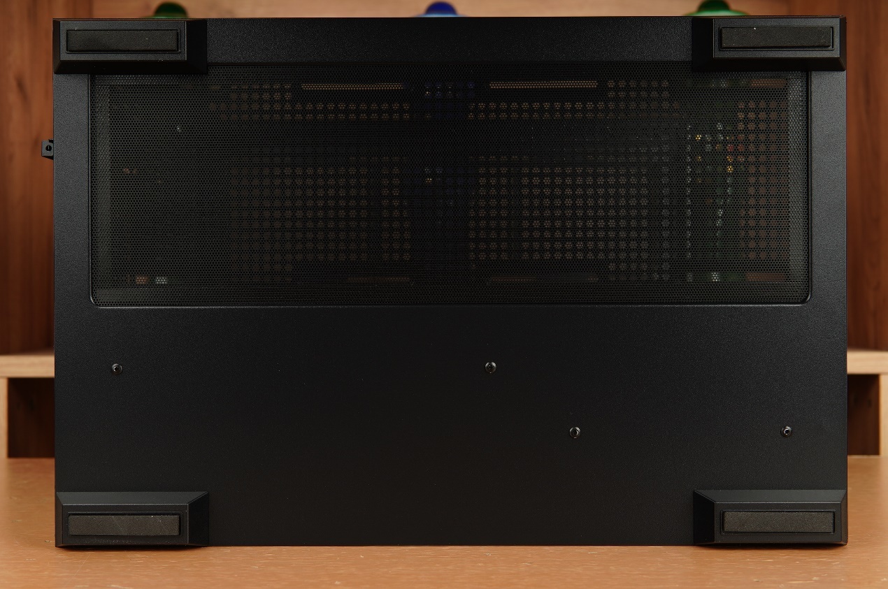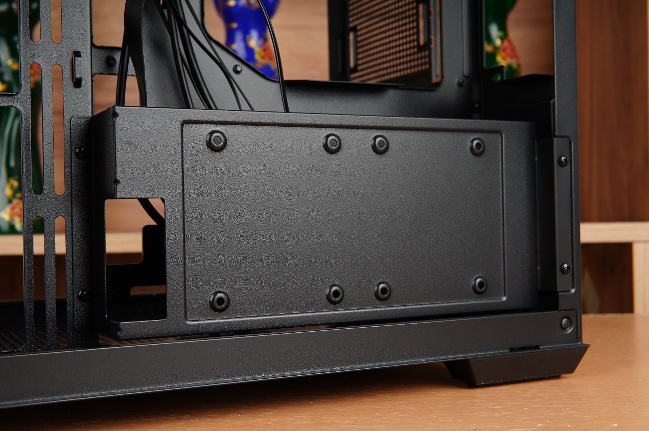 機箱底部的同樣設有風扇支架,標配有磁吸防塵網,可以支持360mm冷排的安裝。