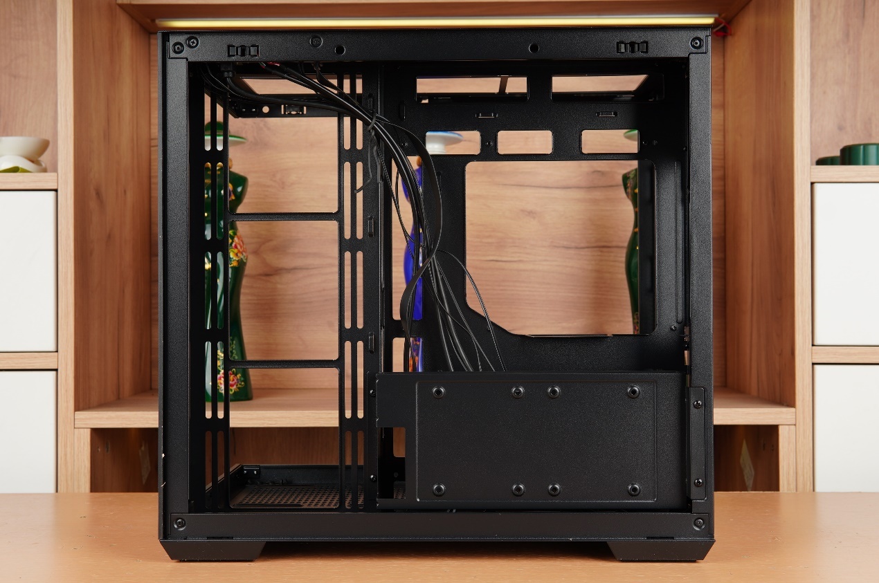 先馬映像的背線倉與常規的雙倉海景房保持一直,電源以及硬盤支架都均放置於此。