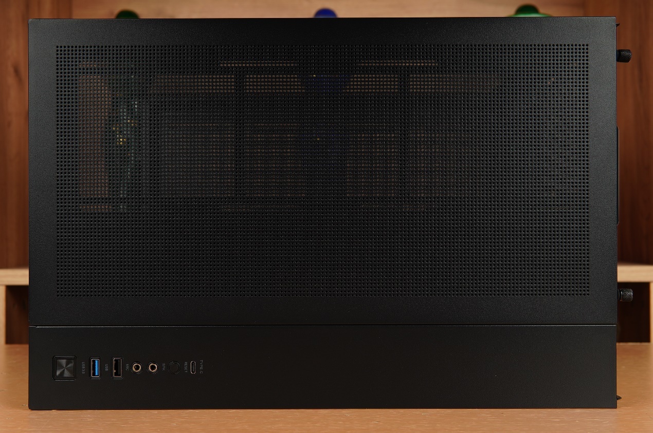 機箱的I/O面板設計在了機箱頂部,配置方面爲2個USB3.0接口、1個Type-C接口以及一組音頻接口,重啓鍵也同樣得到了保留。