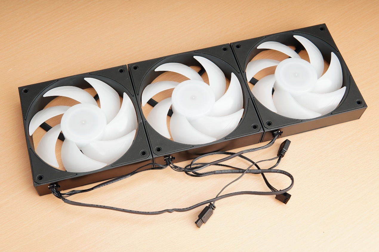 此外XT128系列風扇的還採用了模塊化接線,三聯包裏面會包含1拖3以及1拖2的線材來直連主板,對應的是就是同時使用3把風扇或者2把風扇的場景。在使用線材進行串聯後3把風扇只會出一條總線,減少了大量無意義的線材,玩家使用的更加方便。