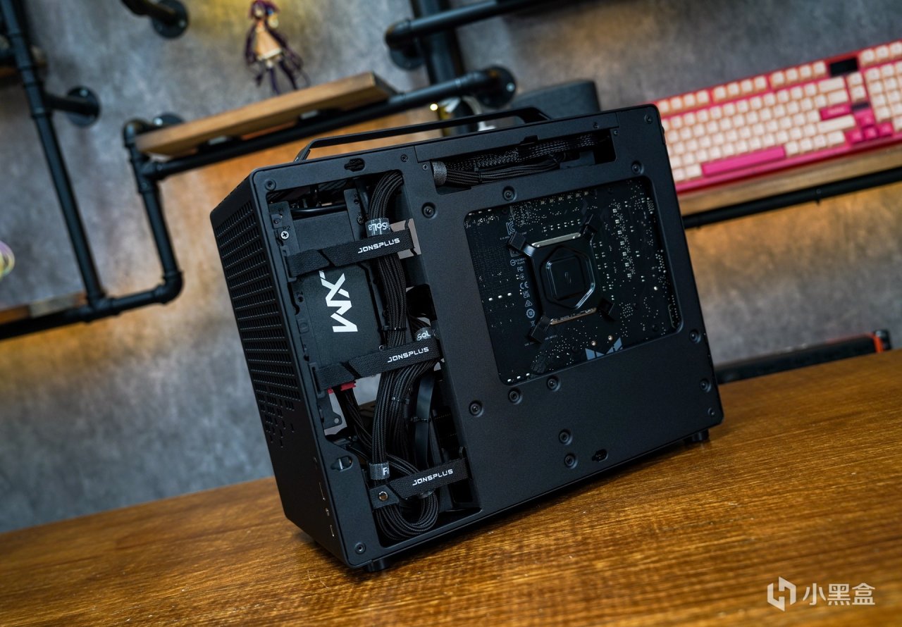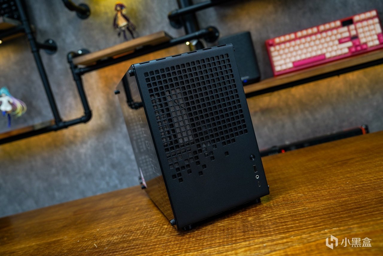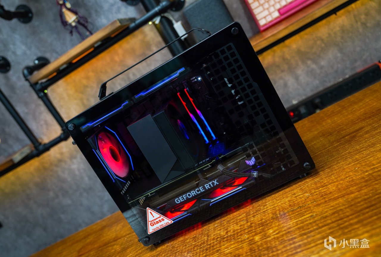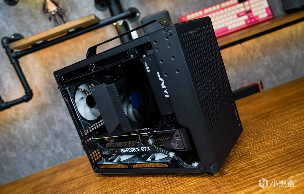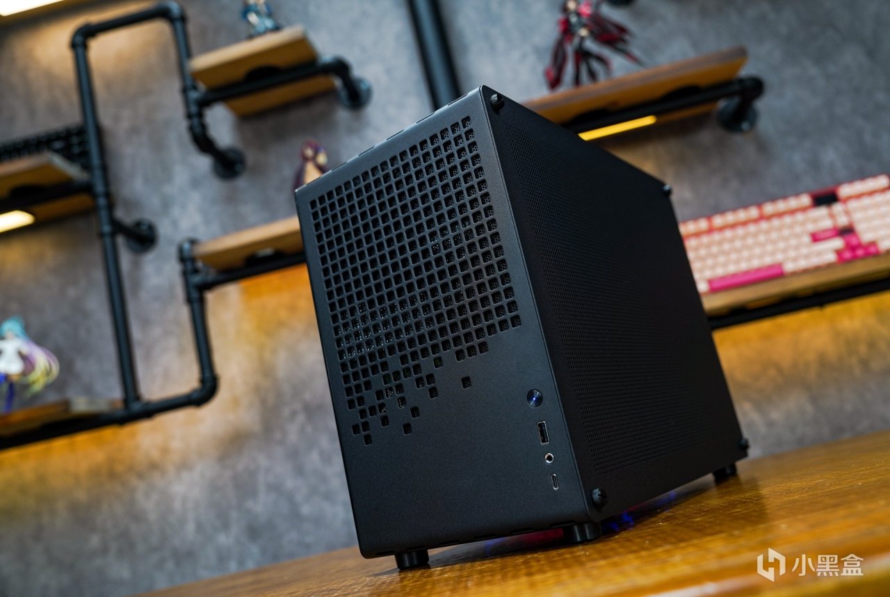 再結合硬件的安裝後的效果,可以看到作爲一款主打緊湊型的20L體積的小型化機箱,既有便於搬動的提手設計,在受衆面上M-ATX主機無疑是受衆更廣泛,也是普羅大衆玩家選擇最多的主機之一,麻雀雖小但是五臟具全。