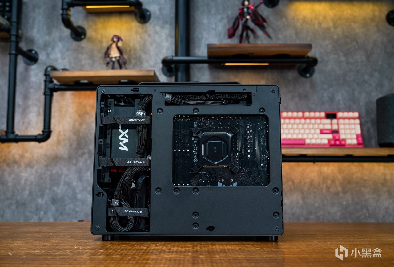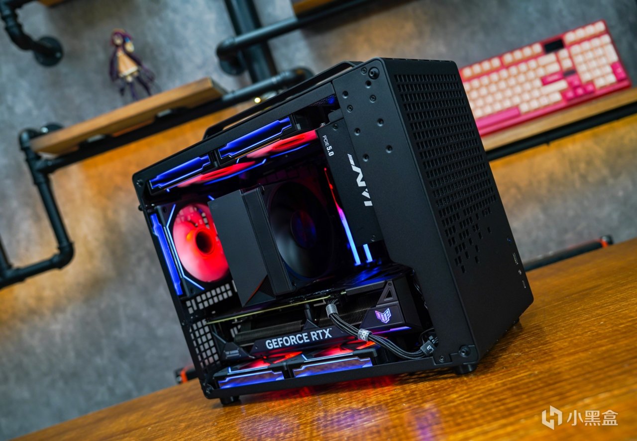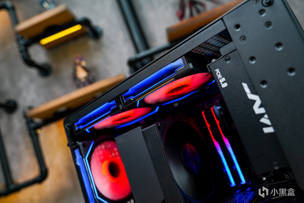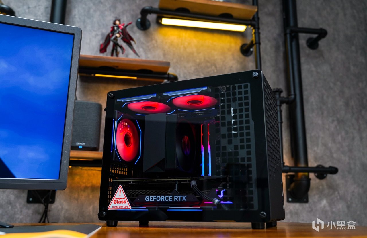 再結合硬件的安裝後的效果,可以看到作爲一款主打緊湊型的20L體積的小型化機箱,既有便於搬動的提手設計,在受衆面上M-ATX主機無疑是受衆更廣泛,也是普羅大衆玩家選擇最多的主機之一,麻雀雖小但是五臟具全。