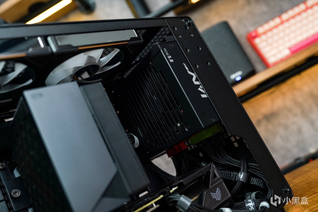 主機背線部分,上面介紹機箱時也有提過了,這裏就看實際出來的效果,可以通過背線編排看到,電源下端是起到收納線材的作用,而CPU供電則可以通過上置的走線通道進行佈線,整理出來的效果讓整個背面更整潔美觀。