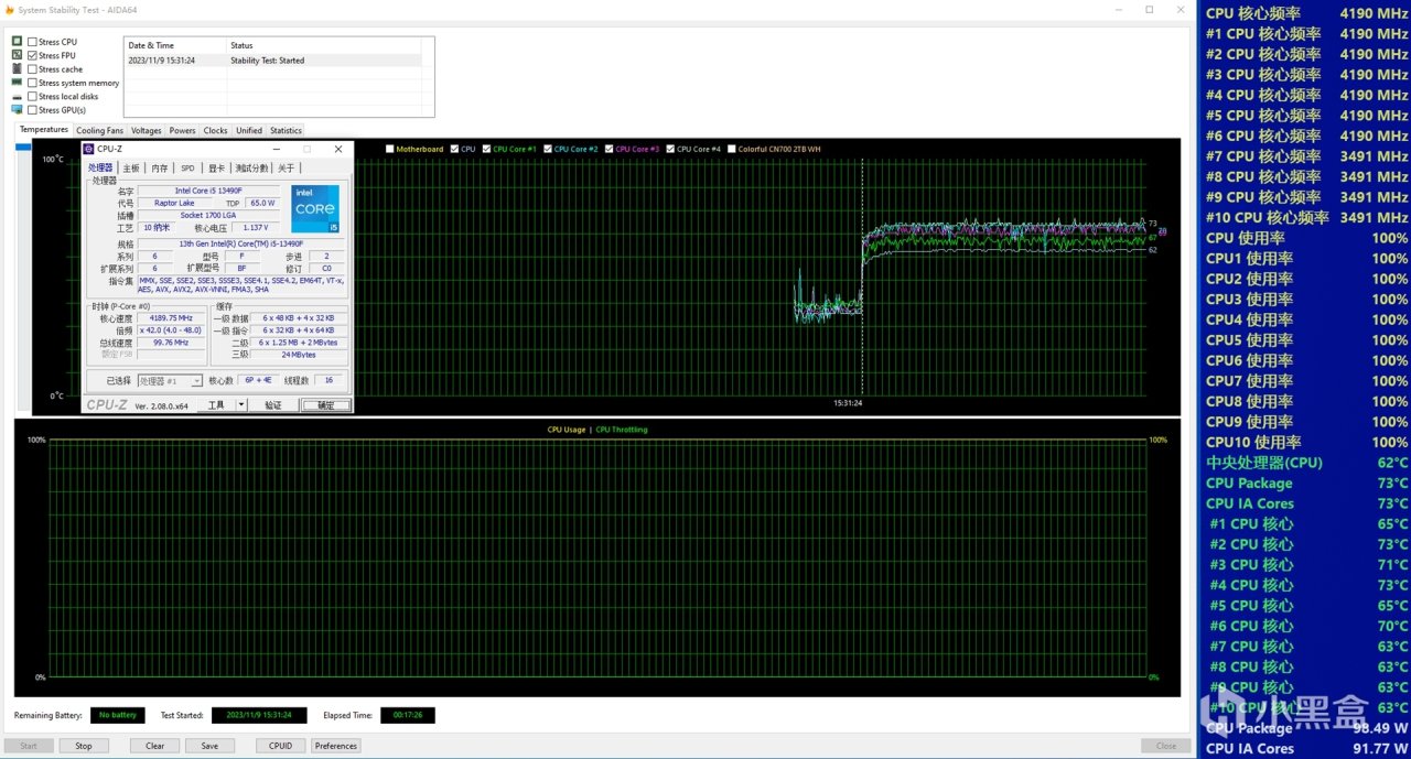 接下來再看下散熱表現:室溫26℃,溼度72%。用RZ 400壓制這顆I5 13490F在全部面板閉合的下的溫度表現:CPU在FPU滿載烤機下,CPU溫度可以保持在63℃,CPU核心溫度維持在73℃。在顯卡散熱表現上:極限溫度測試下,GPU溫度穩定在63℃,顯卡熱點溫度75℃,顯存溫度62℃。以上的實測溫度表現可以說在常溫下也能輕鬆駕馭了。