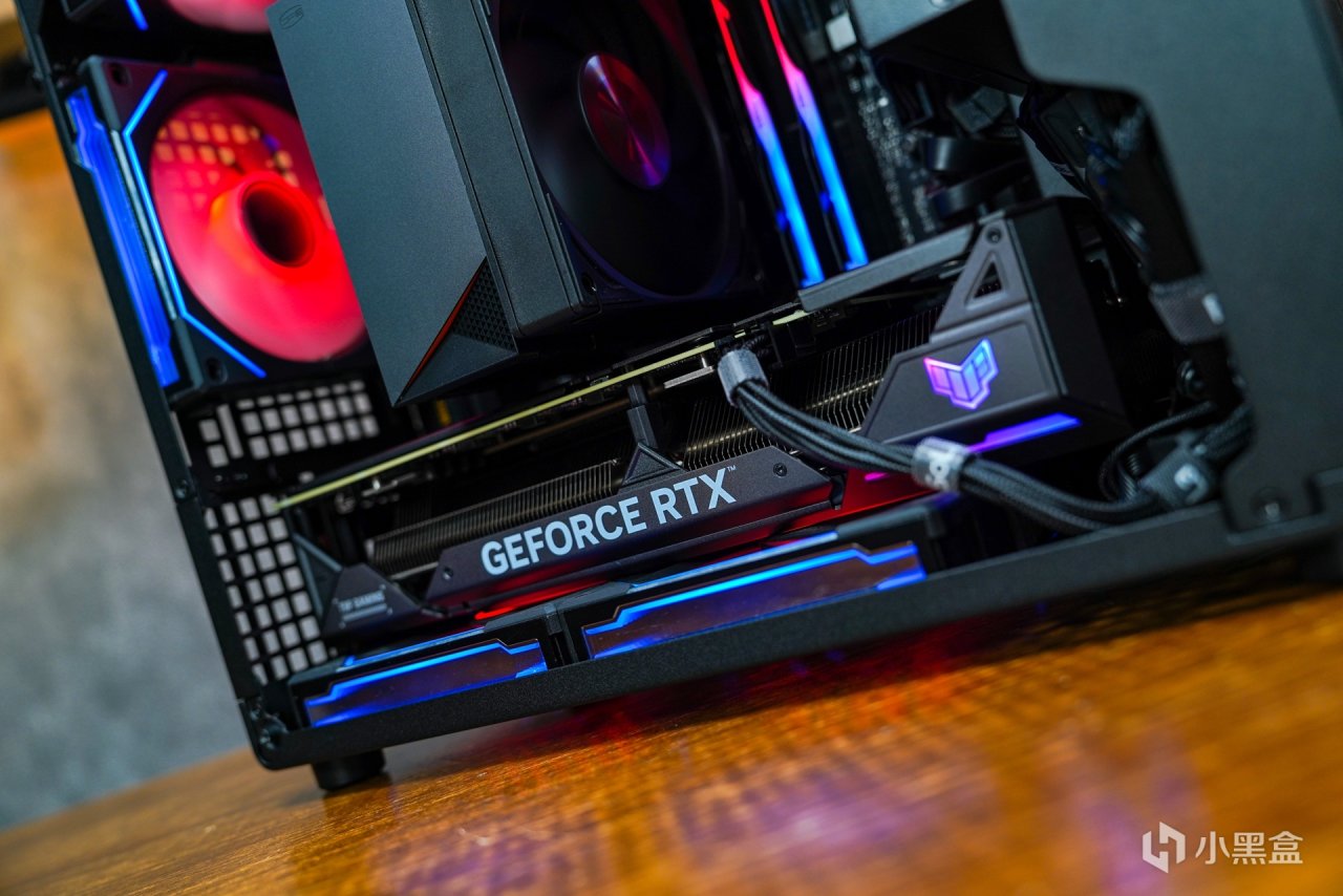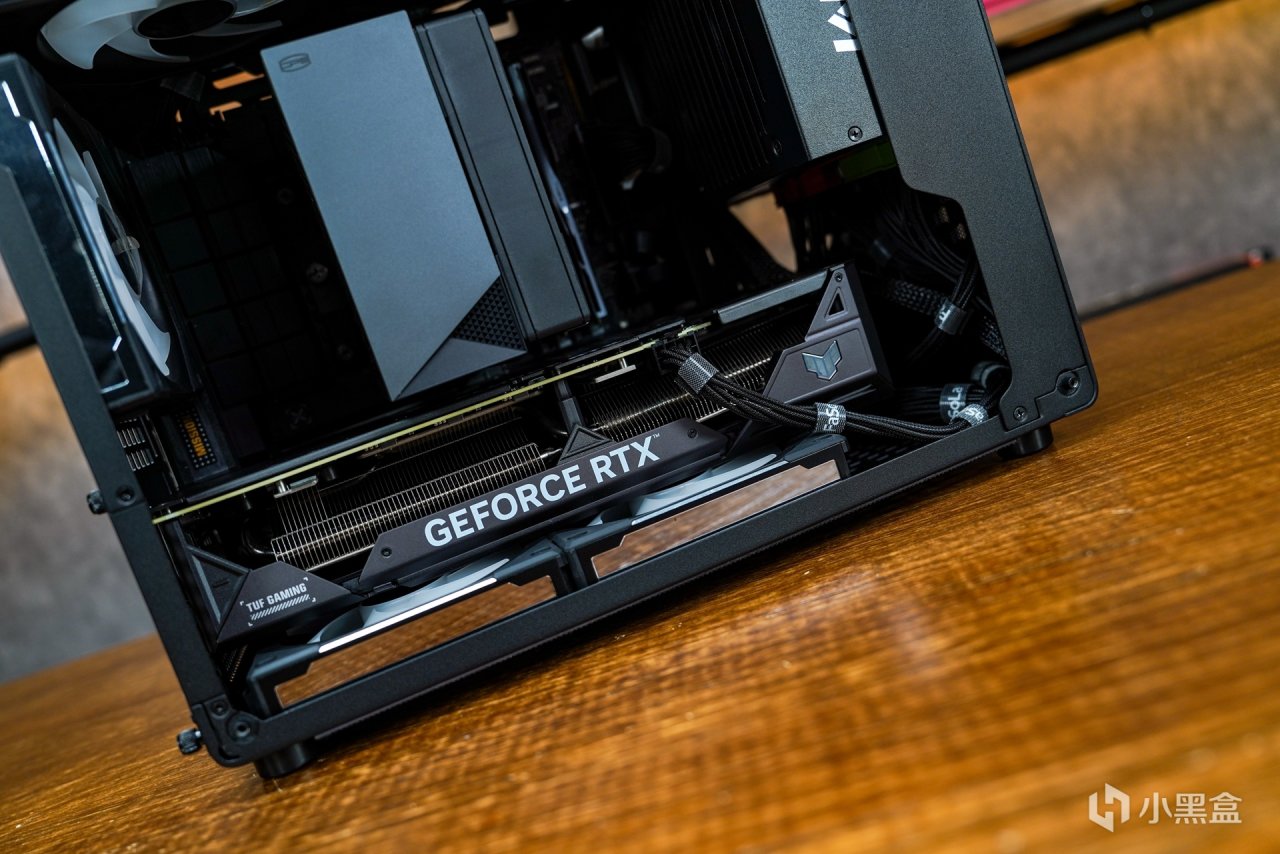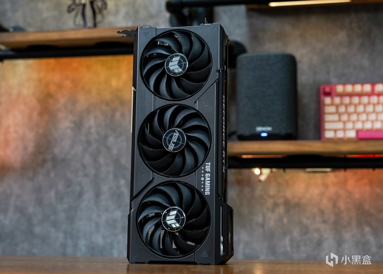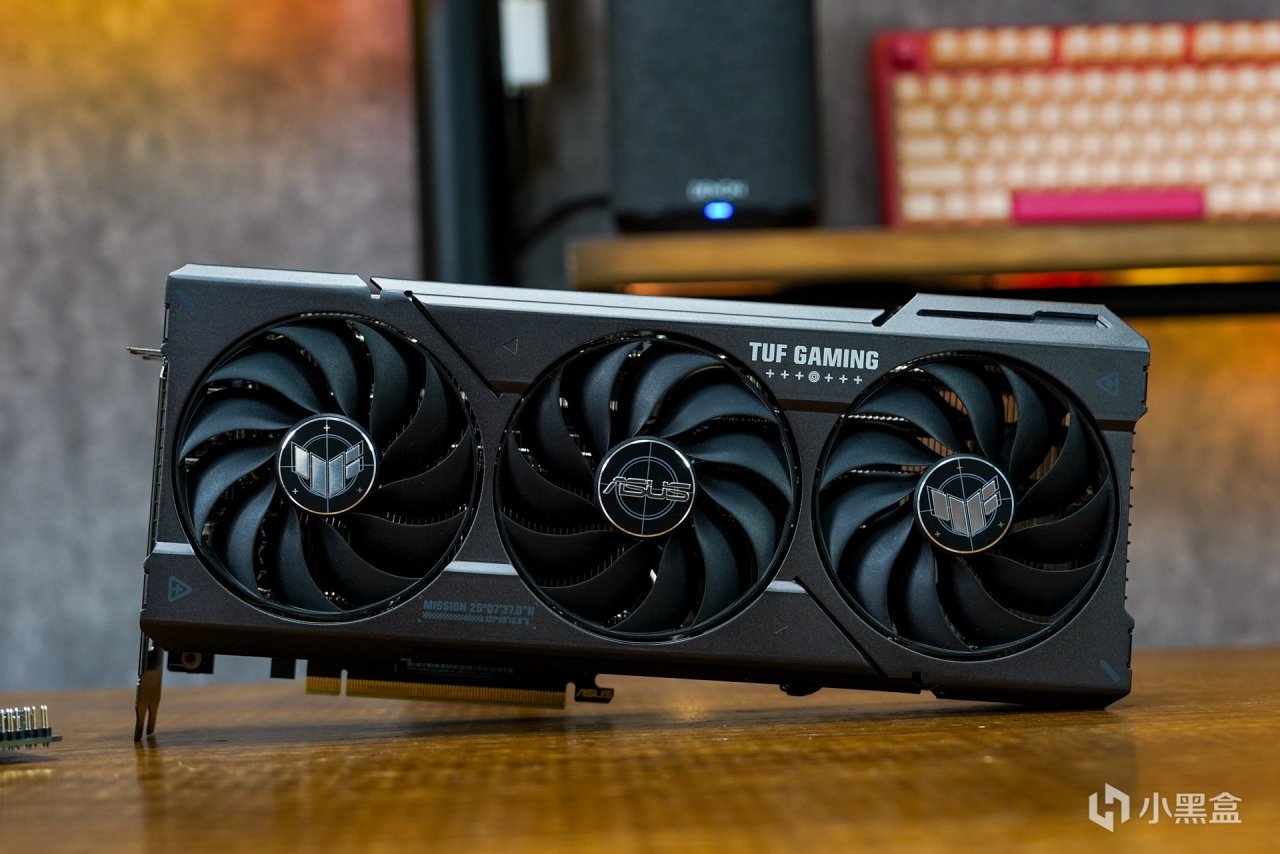 顯卡搭配上使用了這張--華碩TUF RTX 4070 O12G,在價格上隨着SUPER系列的推出,老型號的價格是開始走低了,這張TUF是從朋友手上以4000元以下的價格接盤的,所以性價比還是很高的,也符合我心裏的預算定位。保留了TUF軍規化的外觀設計風格,散熱馬甲全金屬材質打造,啞光黑配色,磨砂的質感,表面 TUF GAMING 英文名及華碩總部座標點綴。顯卡整體長度爲 305mm,顯卡正面搭配三個 Axial-tech 軸流風扇,支持全高阻隔環,能大幅提升靜壓,另中間風扇與兩側風扇爲正逆轉動設計,可以減少空氣亂流,提高散熱氣流利用率,並且支持低負載停轉技術,在低負載狀態下讓風扇進入更高效的降噪運行。