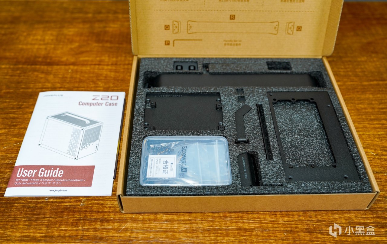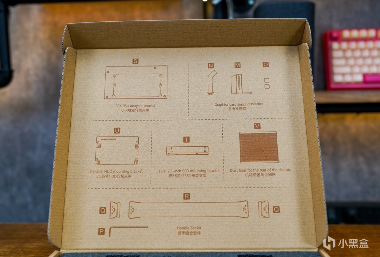 附件配件盒也是非常豐富的,除了常規的安裝螺絲已經工具和可拆卸提手之外,還有附有SFX電源轉接支架、顯卡支撐架、以及兩個硬盤支架和一塊機箱後置防塵濾網來對應不同玩家的需求。