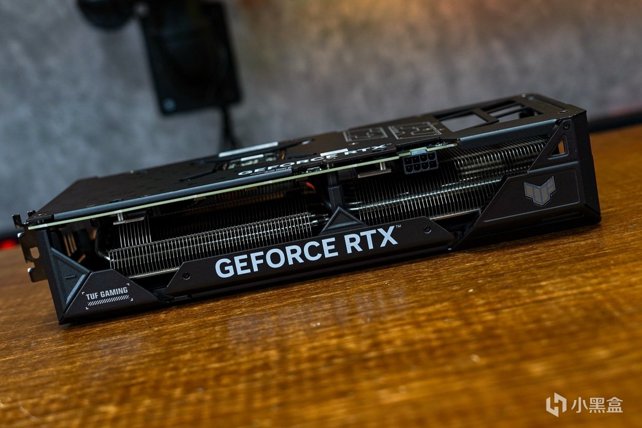 背面的金屬背板,也是採用和正面一樣的啞光黑配色+磨砂質感漆面,覆蓋型均熱面板上的 TUF 元素及相關圖形文字修飾,尾部大面積的鏤空,開孔樣式呼應表面圖案,形成一個 TUF 圖形 LOGO ,開孔可有效提升背面的散熱效率。顯卡採用的是上下均爲大面積的鰭片外露散熱設計,依然採用的是傳統的兩段式散熱模塊佈局。側面馬甲厚度約64mm,採用2.5槽位設計。