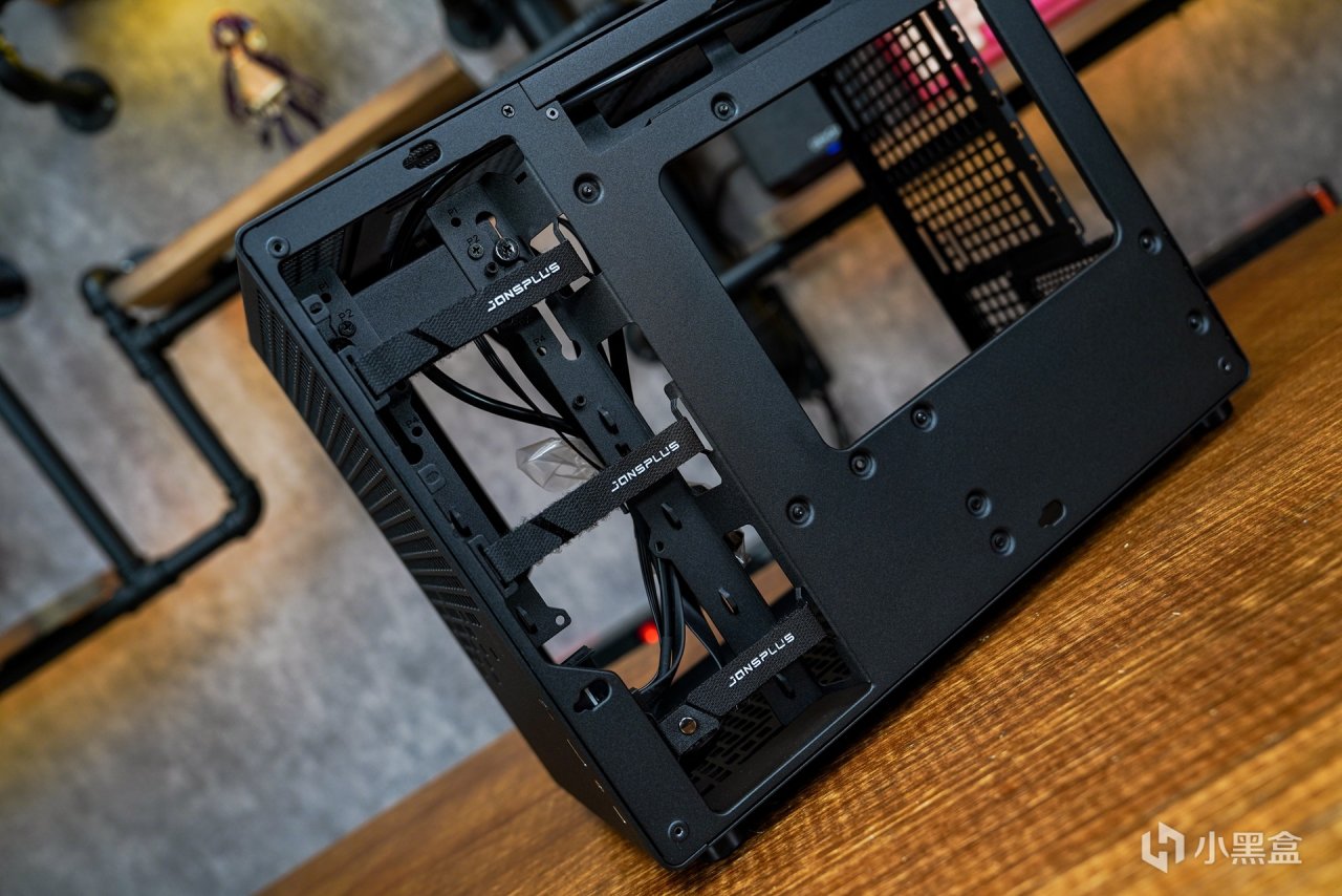 箱體的用料:外框面板和內裏均採用了金屬。這和喬思伯旗下產品一貫設計風格(鋁鎂+五金)是有所出入的,或許是考慮到成本與價格定位吧。但是磨砂質感的漆面足以撐起整個機箱的厚重感。而鋼材的厚度均達到了1MM以上,用料非常紮實。硬件安裝區域其實和喬思伯的“爆款”D30/D31內部差別不大,前置電源安裝,往後點就是主板和顯卡這些主要硬件的安裝區域,上置散熱安裝位是採用抽拉式支架設計,這個設計對於安裝散熱風扇或者水冷冷排時是非常方便的設計之一。
