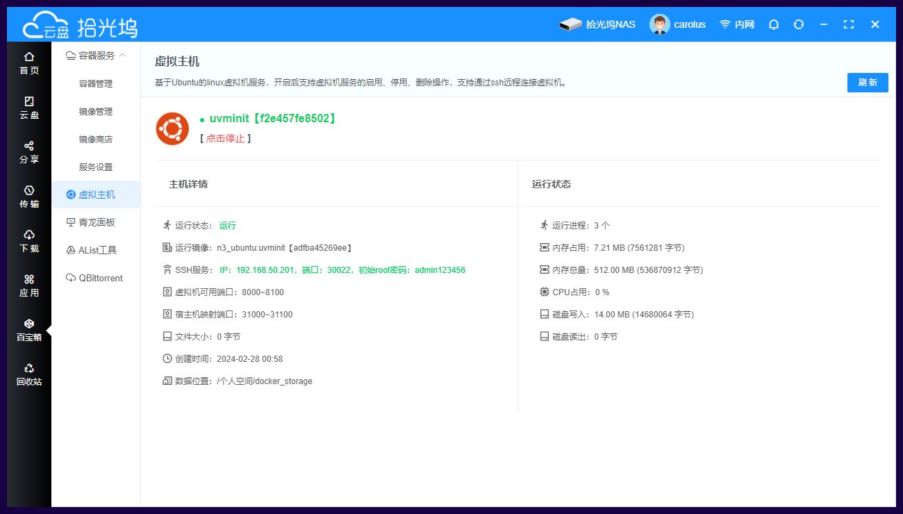 另外在百宝箱里面则是有Docker、Ubuntu虚拟主机、青龙面板、Alist、Qbittorrent。