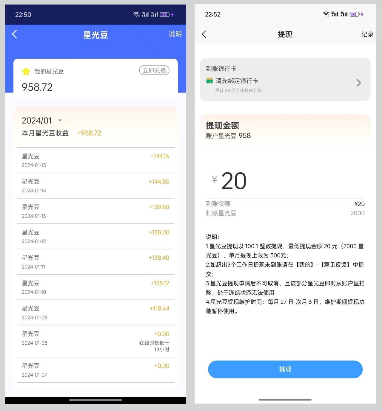 而在实际体验中可以看到,我家里的是电信宽带,无公网IP,上传速度是30Mbps,实际每天可以得到140左右的星光豆,那么就是1.4元。