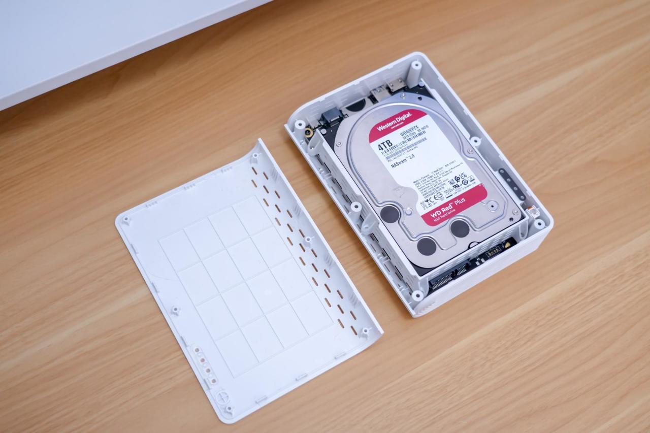 打开N3的方式也比较简单,它是卡扣设计,打开你就会立即看到硬盘位。硬盘托架采用塑料材质,通过螺丝进行固定,确保硬盘的稳定。