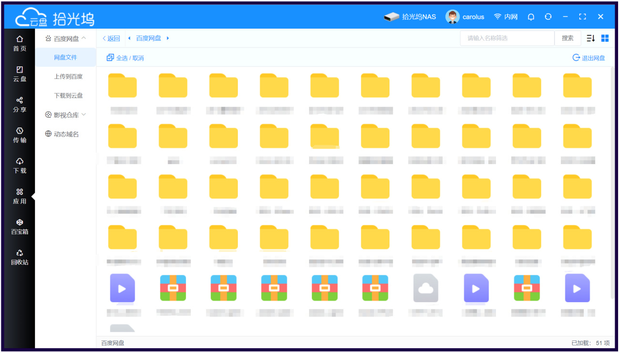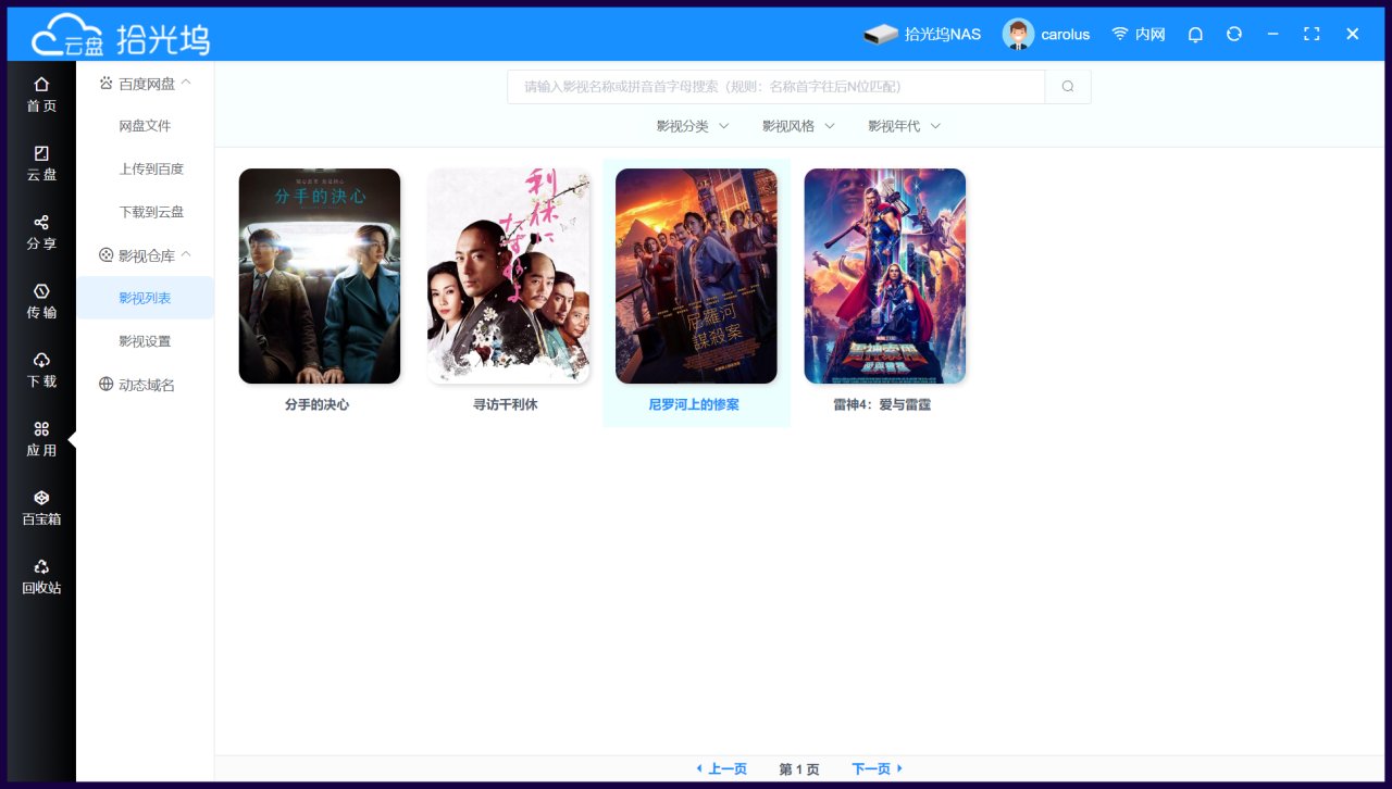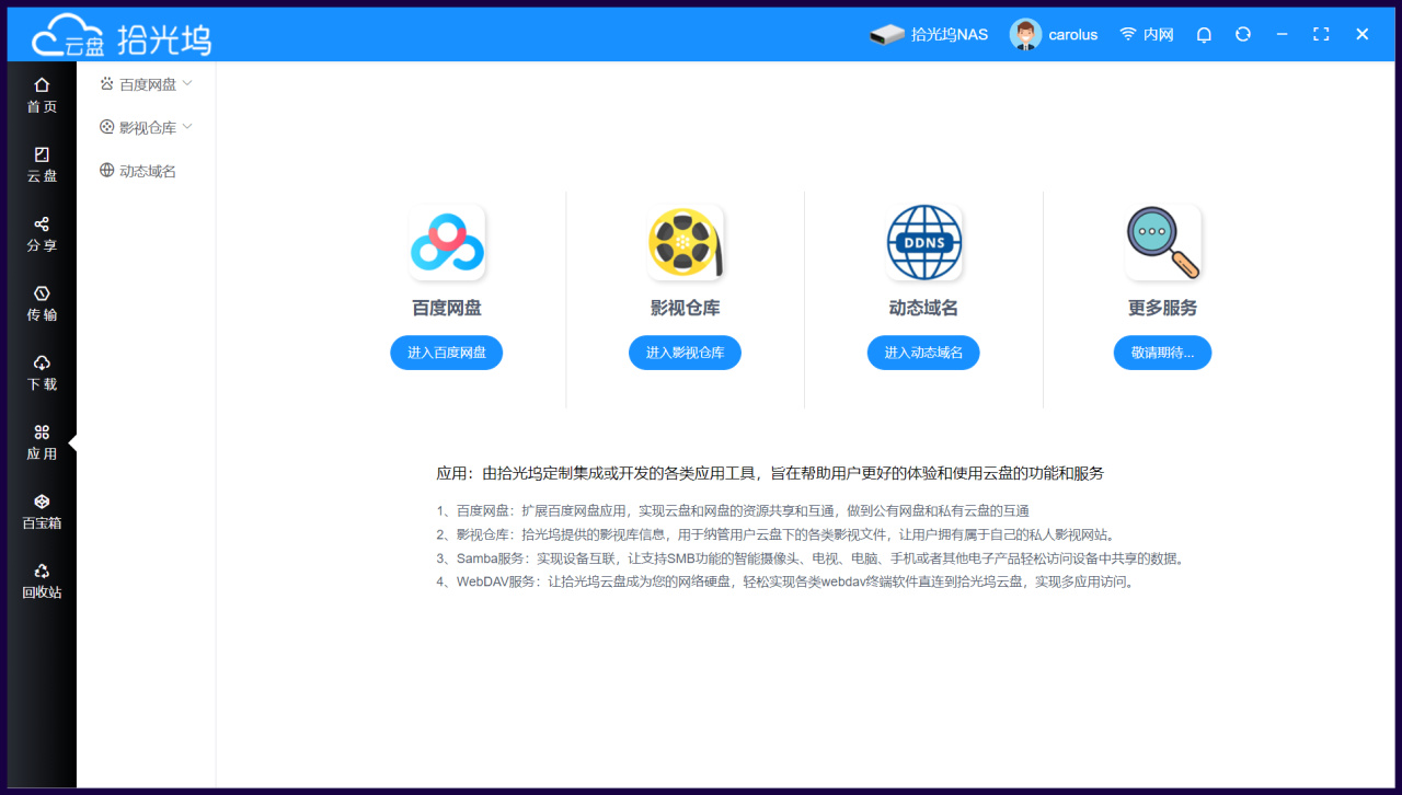 拾光坞N3提供了非常多的玩法,应用方面包括有百度网盘、影视仓库、动态域名。