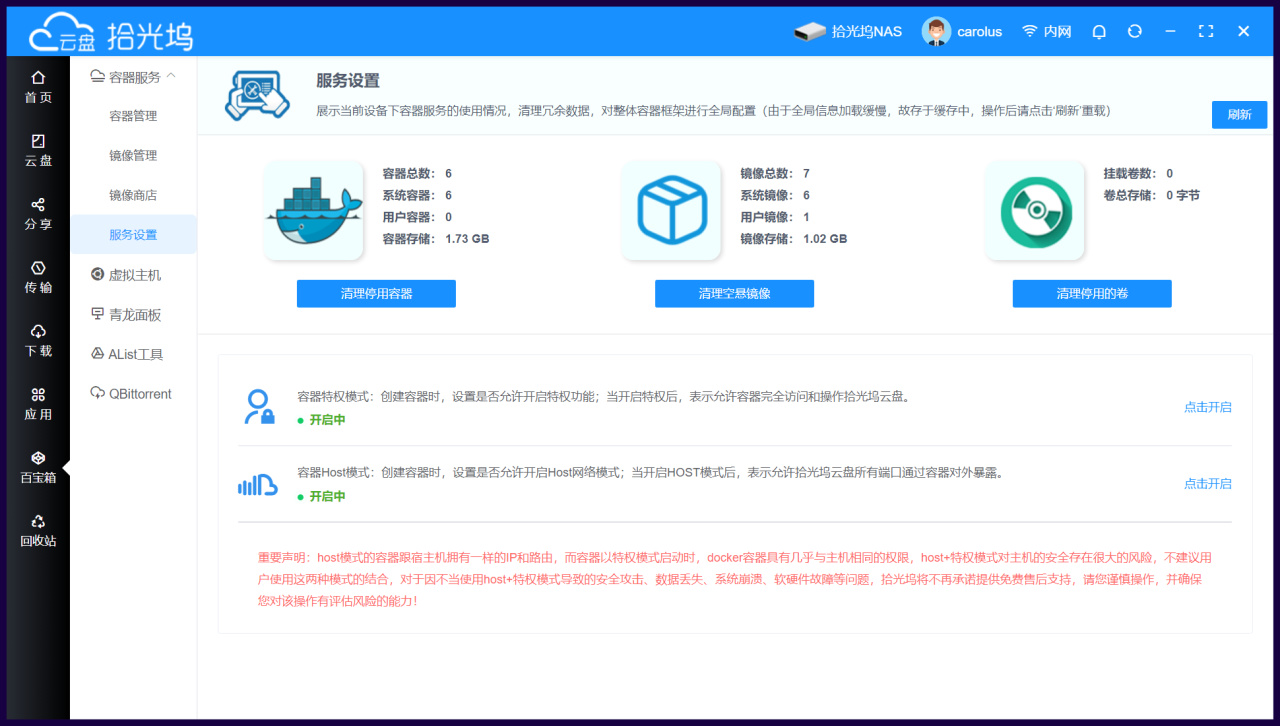 这个是一个重点。很难见到在这么小的一个品牌上面看到Docker容器服务,通过这个服务,咱们就可以随意搭建各种服务应用在上面了。