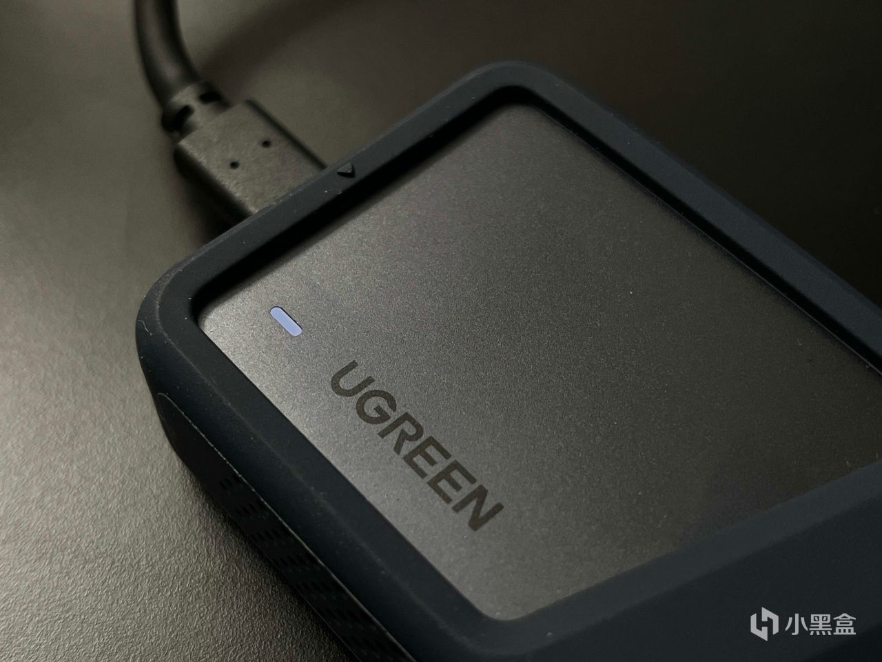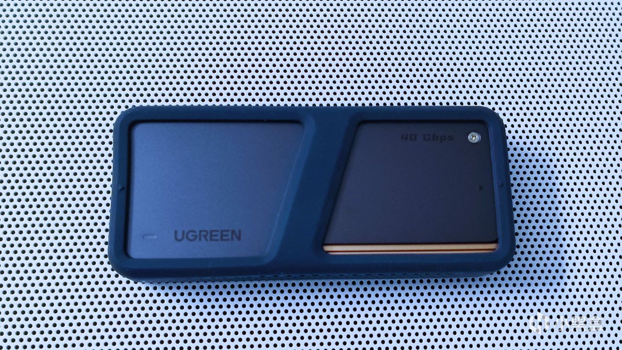 在绿联固态硬盘盒的一侧有开孔,主要是方便内部的小风扇提供散热风道。
