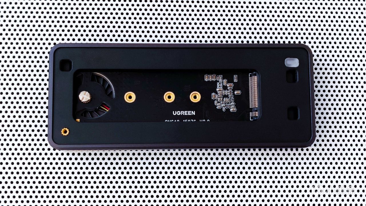 取下盖板就能看到移动固态硬盘盒的内部结构了,通过对应M.2 SSD尺寸孔位的十字螺丝即可固定SSD,绿联是支持2230、2242、2260、2280这四种尺寸的SSD。