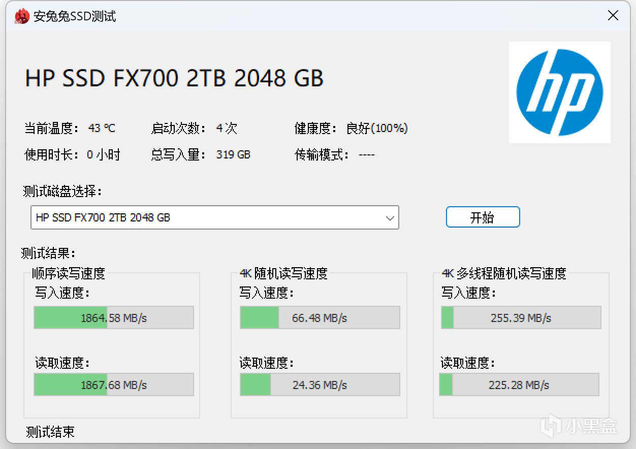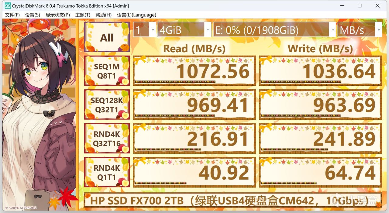 可以看到HP FX700是全新的固态盘,2TB容量还没测速,通电时间和通电次数也表明了是新盘无误,在硬盘盒上也已经是显示UASP模式(NVM Express)。1️⃣ 10Gbps 测速