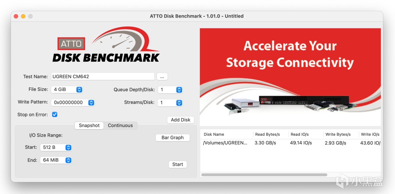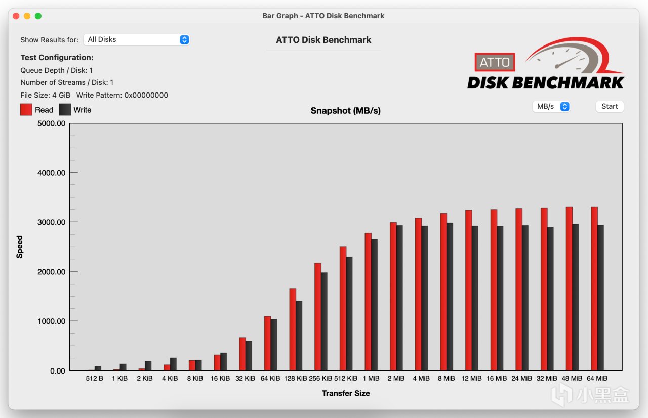 用ATTO DISK BENCHMARK软件测速,连续读取:3.30 GB/s,连续写入:2.93 GB/s。