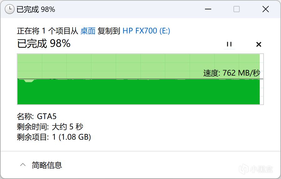 实测GTA5游戏压缩包(≈79GB),在Windows系统里直接从桌面复制到绿联USB4固态硬盘盒(HP FX700 2TB)实时传输速度:762 MB/秒。2️⃣ 20Gbps 测速