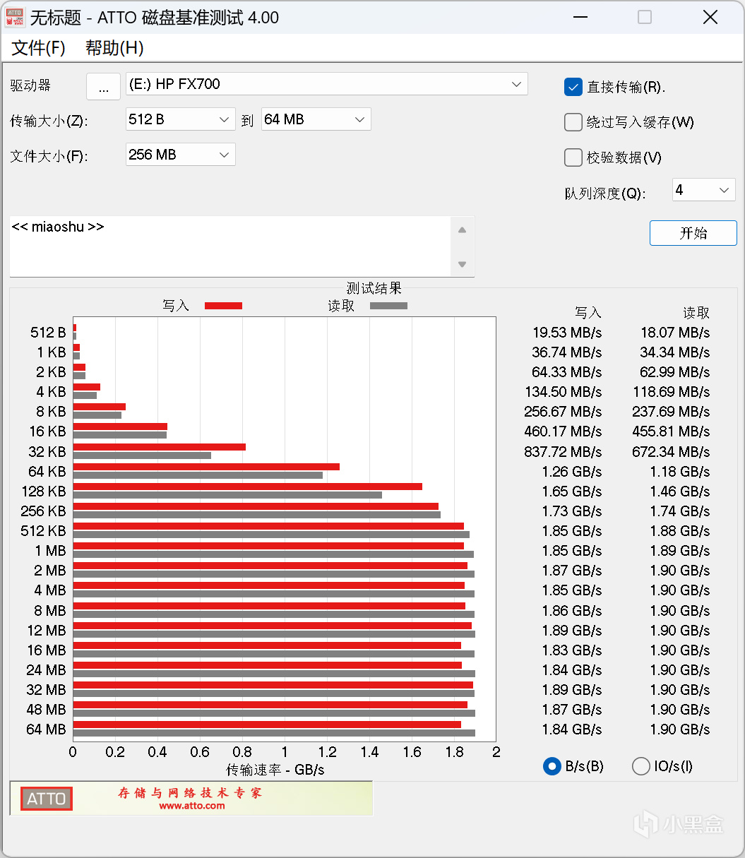 用ATTO Disk Benchmark软件测试小文件的读写情况,传输大小从512 B到64 MB,文件大小:256 MB进行测速,默认是:直接传输,可以看到读取速度维持最高在1.90 GB/s,而写入速度维持最高在1.89 GB/s。