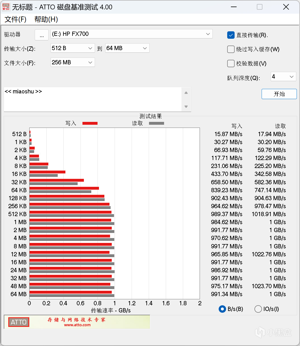用ATTO Disk Benchmark软件测试小文件的读写情况,传输大小从512 B到64 MB,文件大小:256 MB进行测速,默认是:直接传输,可以看到读取速度维持最高在1023.70 MB/s,而写入速度维持最高在991.77 MB/s。