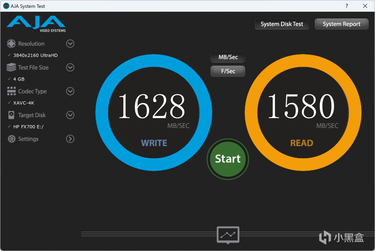 用 AJA System Test 软件进行测速,连续写入:1628 MB/s,连续读取:1580 MB/s。