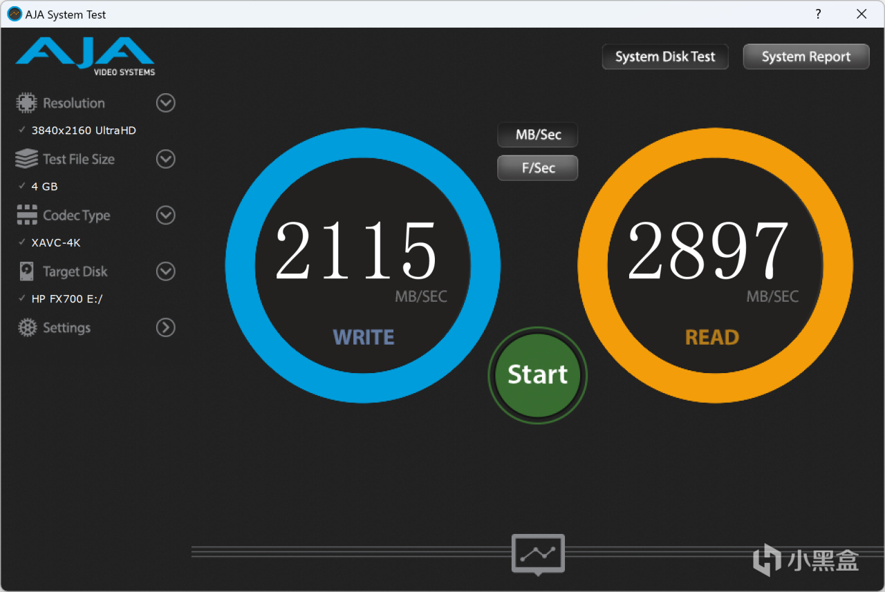 用 AJA System Test 软件进行测速,连续写入:2115 MB/s,连续读取:2897 MB/s。