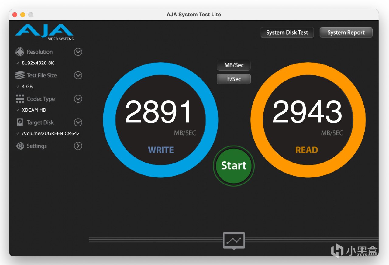 用AJA System Test Lite 软件测速,连续写入:2891 MB/s,连续读取:2943 MB/s。