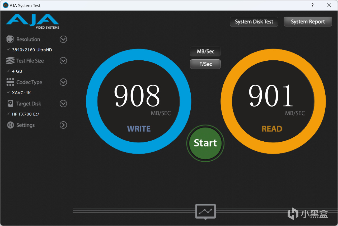 用 AJA System Test 软件进行测速,连续写入:908 MB/s,连续读取:901 MB/s。