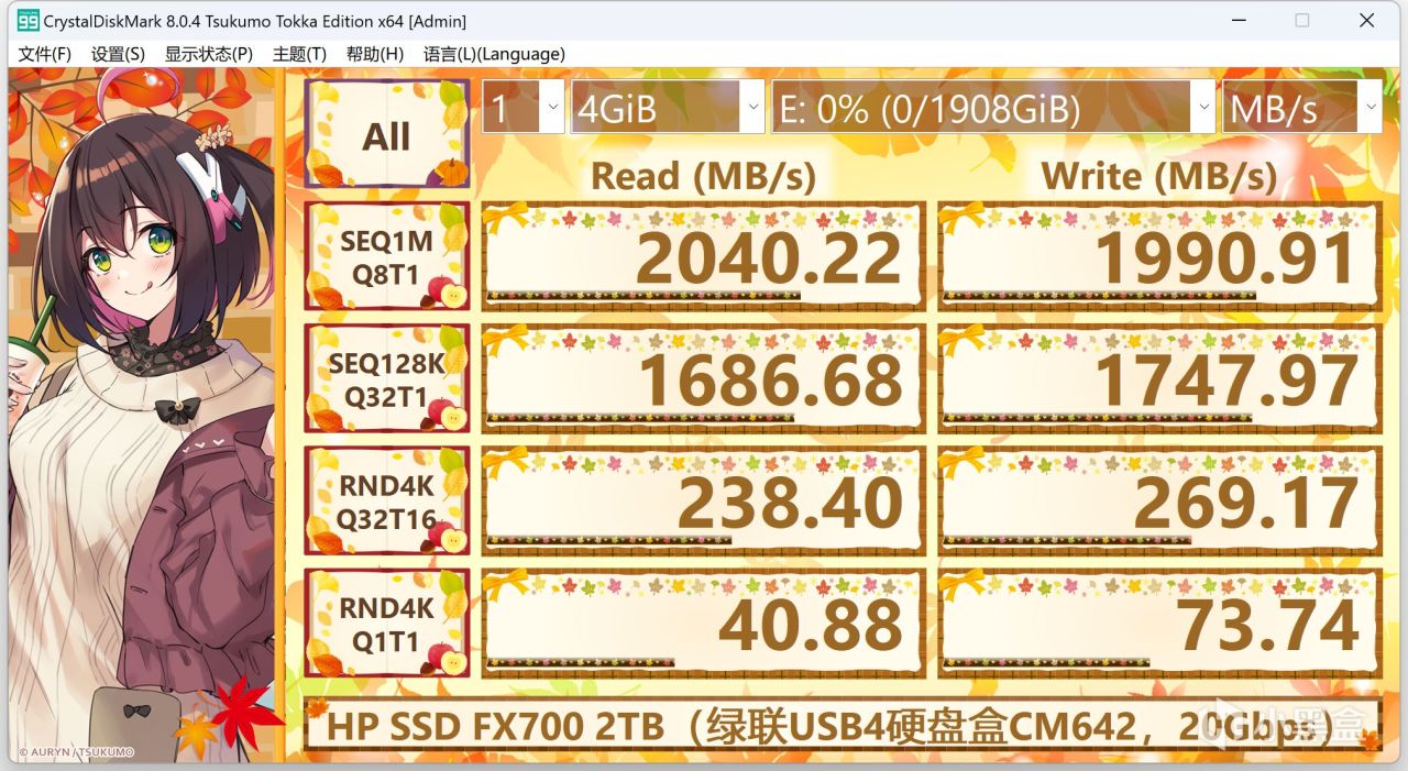 用CrystalDiskMark软件进行测速,连续读取:2040.22 MB/s,连续写入:1990.91 MB/s。