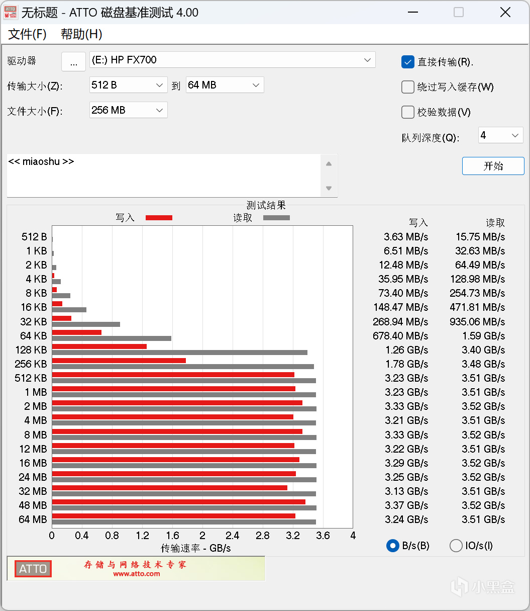 用ATTO Disk Benchmark软件测试小文件的读写情况,传输大小从512 B到64 MB,文件大小:256 MB进行测速,默认是:直接传输,可以看到读取速度维持最高在3.52 GB/s,而写入速度维持最高在3.37 GB/s。