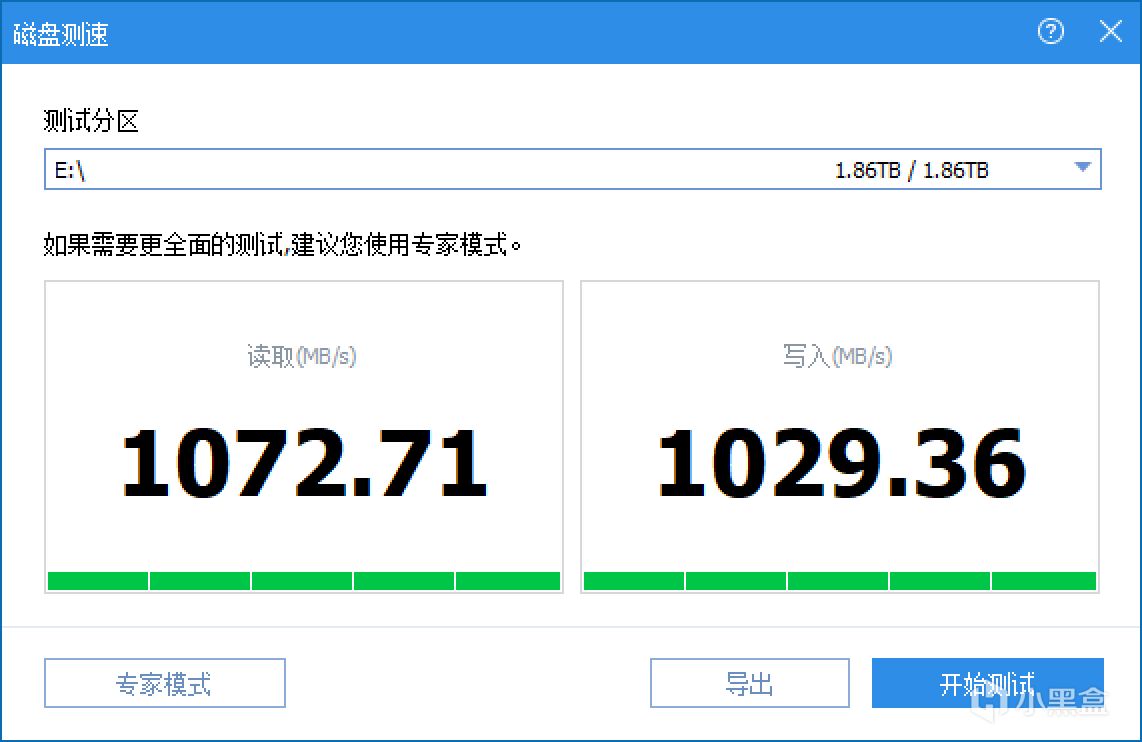用傲梅分区助手的磁盘测速,可以看到读取速度:1072.71 MB/s,写入速度:1029.36 MB/s。