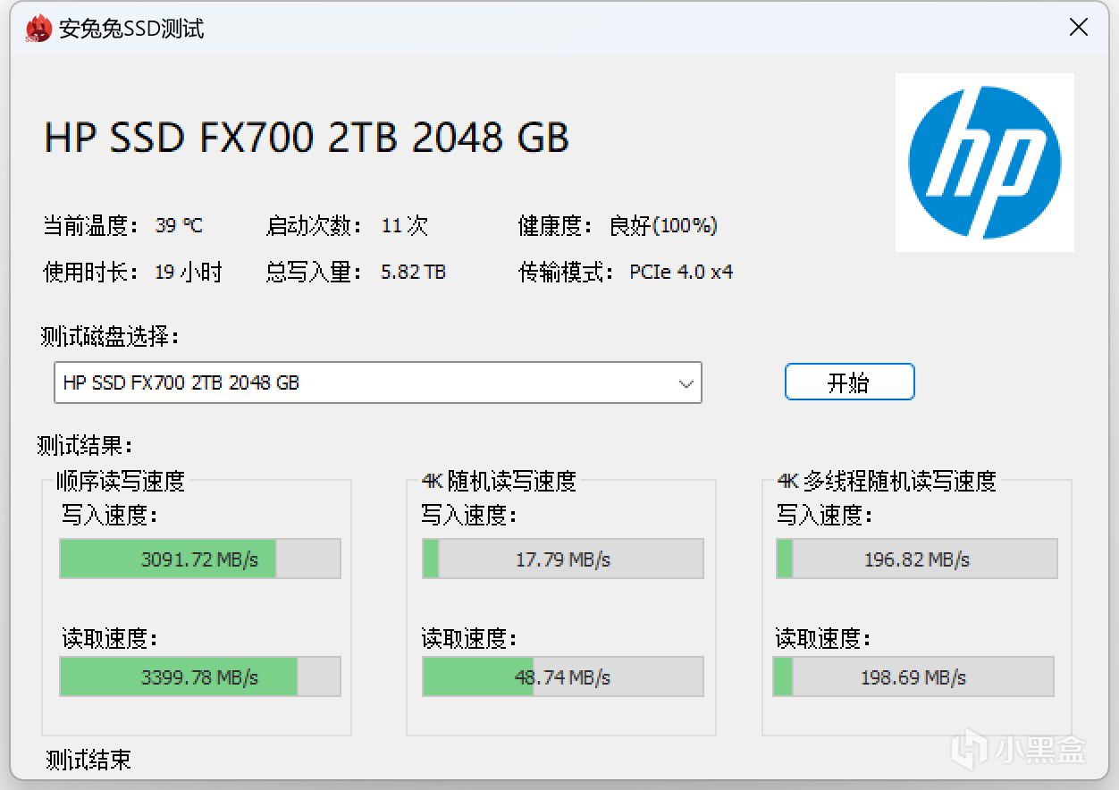 用安兔兔SSD软件进行测速,可以看到写入速度:3091.72 MB/s,读取速度:3399.78 MB/s。
