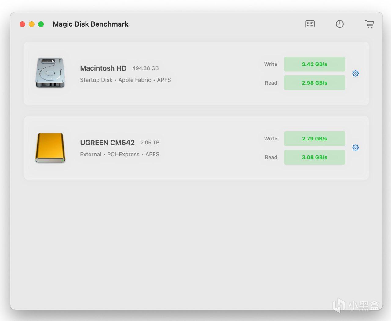 用Magic Disk Benchmark 软件测速,在绿联CM642移动固态硬盘盒上,连续写入:2.79 GB/s,连续读取:3.08 GB/s。对比在MacBook Pro M1笔记本电脑的512GB固态硬盘上连续写入:3.42 GB/s,连续读取:2.98 GB/s。⭕️ 硬盘盒测温