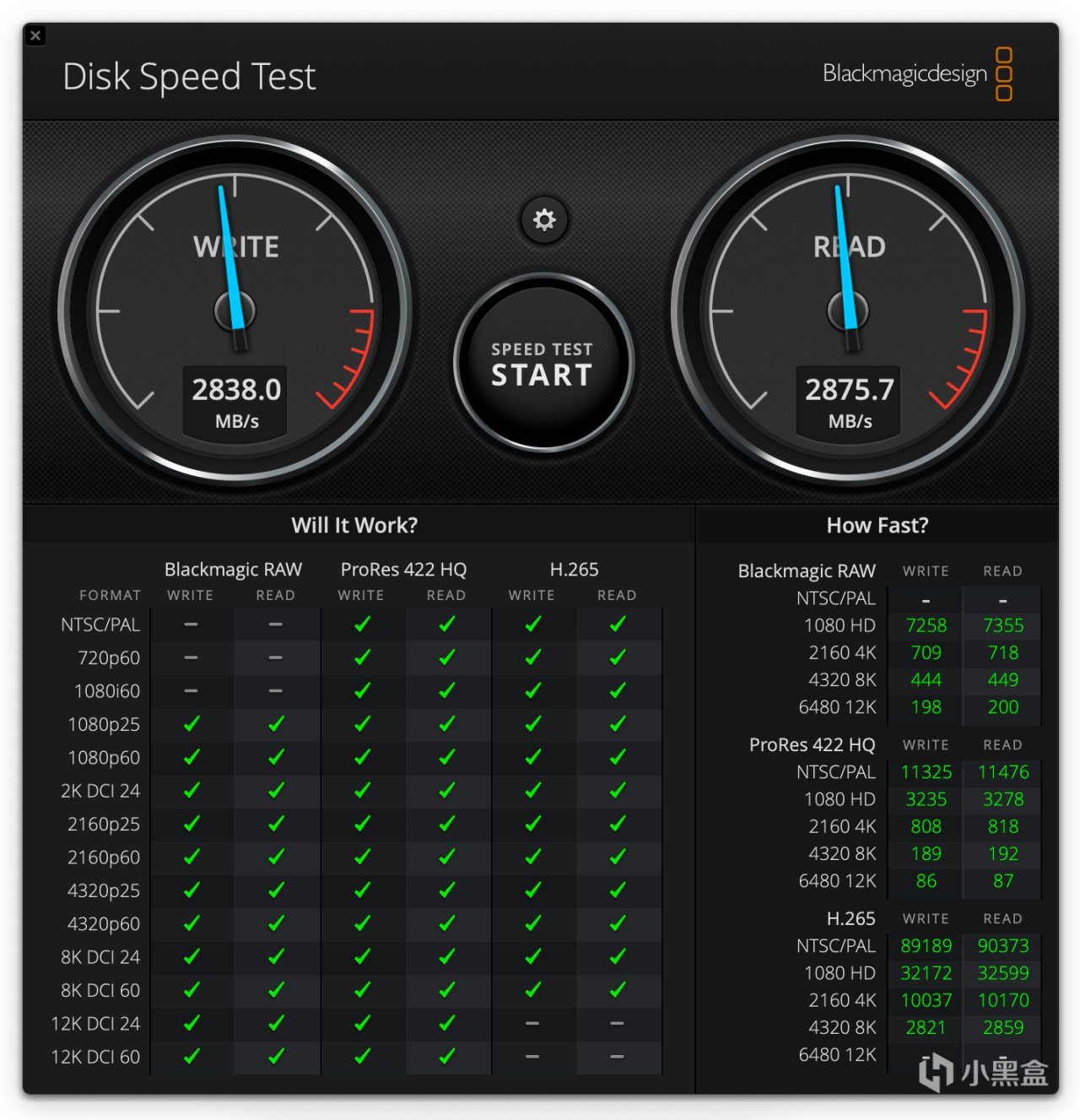用Disk Speed Test软件测速,连续写入:2838.0 MB/s,连续读取:2875.7 MB/s。